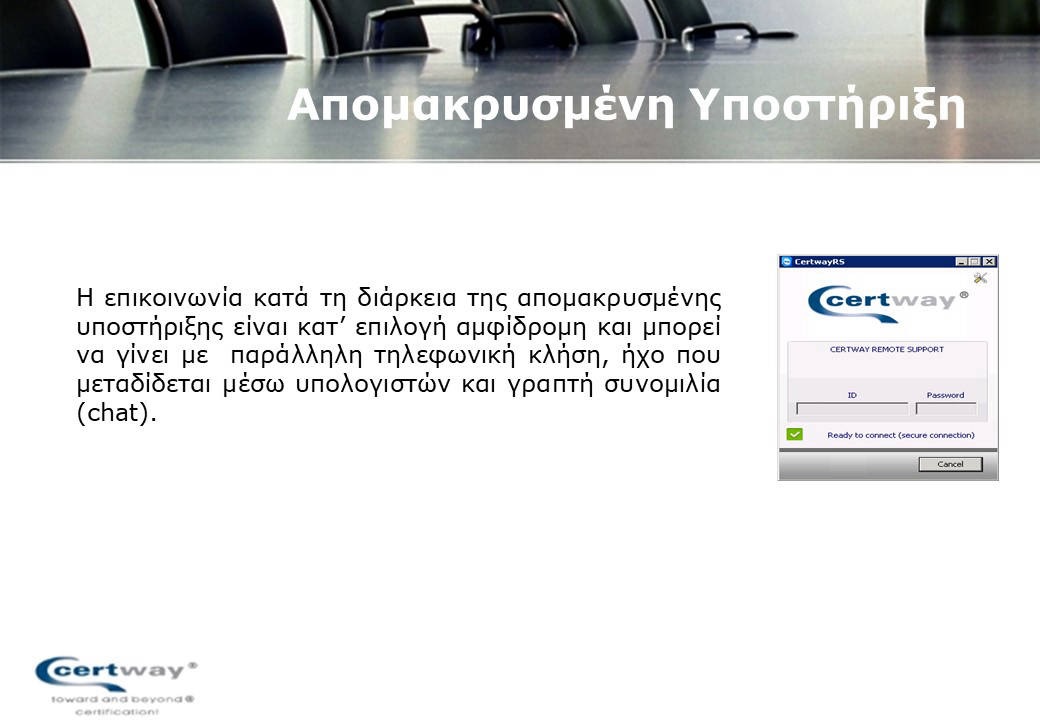 Η Certway παρέχει απομακρυσμένες υπηρεσίες υποστήριξης, χρησιμοποιώντας προηγμένα και ασφαλή εργαλεία πληροφορικής.